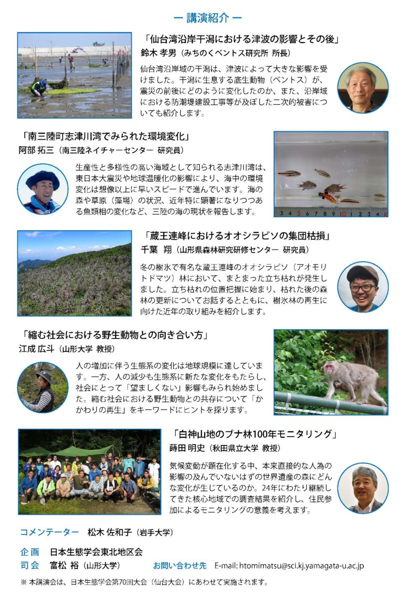 本講演会では、東北の生態系で近年起こった変化や、 将来起こりうる変化に向き合ってきた研究者が、 活動を紹介します。私たちは、生態系の変化をどのように捉え、 向き合えば良いのか、一緒に考える機会になればと思います。