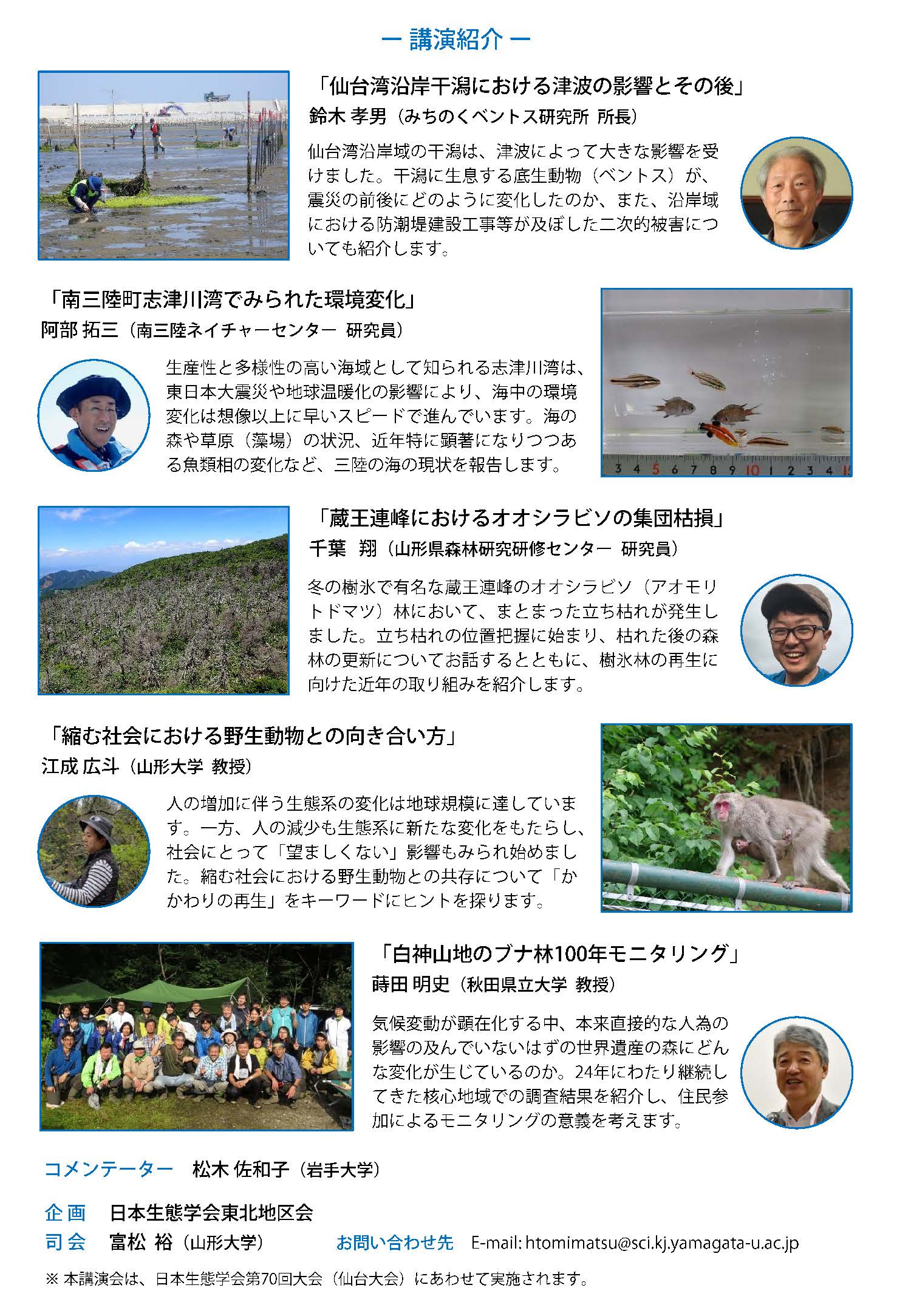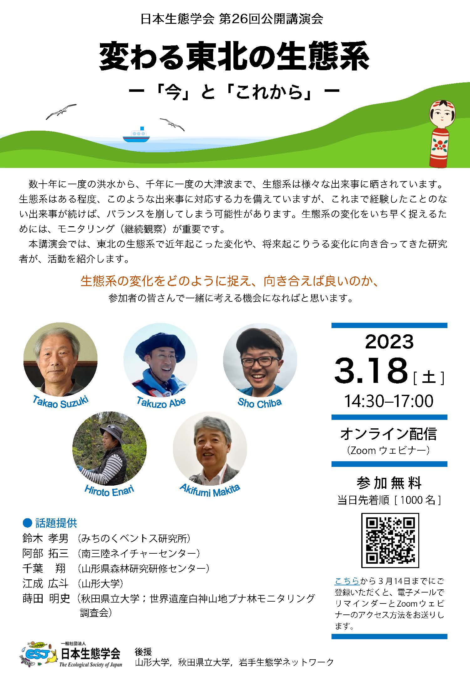 本講演会では、東北の生態系で近年起こった変化や、 将来起こりうる変化に向き合ってきた研究者が、 活動を紹介します。私たちは、生態系の変化をどのように捉え、 向き合えば良いのか、一緒に考える機会になればと思います。